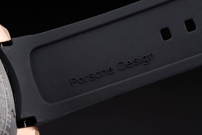 The design features a brushed stainless steel screwed-down back adorned with exquisite inscriptions, while the ion-plated bezel showcases a tachymeter for those who value precision. One of the watch’s standout features is its striking black rubber strap, designed with a tyre-groove pattern that pays homage to the iconic Porsche heritage, complete with a heat-embossed Porsche stamp. The strap is paired with a rose-gold hook-buckle clasp, further elevating the timepiece’s luxurious aesthetic. With a diameter of 57 x 48 mm and a case thickness of 14 mm, this watch is bold yet comfortable to wear.